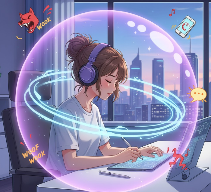 - 백색소음/핑크소음 (사운드 마스킹): 카페의 백색소음처럼, '쉬-'하는 일정하고 넓은 주파수의 소음은 갑작스러운 외부 소음(문 닫는 소리, 자동차 경적 등)을 덮어주는 '사운드 마스킹(Sound Masking)' 효과를 가집니다. 이를 통해 뇌가 소음 자극에 일일이 반응하지 않도록 하여, 평온한 집중 상태를 유지시켜 줍니다.